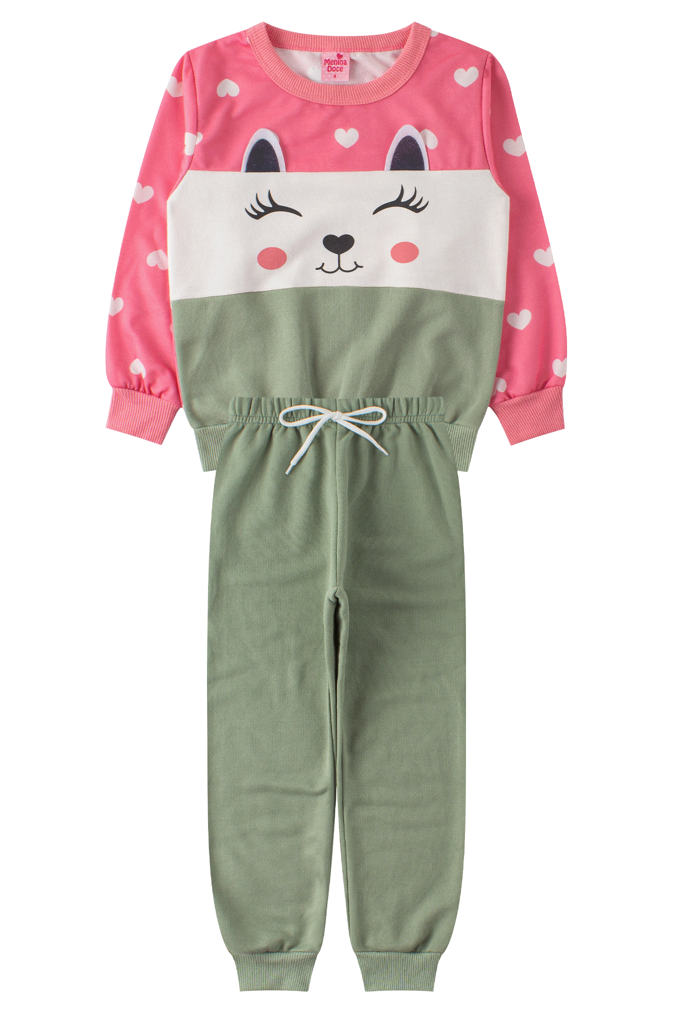 Conjunto Infantil Feminino Moletom Sublimado Peluciado/Moletom Peluciado Cute Goiaba composto por duas peças. Blusão confeccionado em moletom sublimado peluciado (50% algodão 50% poliéster), gola redonda em ribana, recortes frontais com aplique de cores contrastantes e estampa com aplique de orelhinhas em feltro (75% algodão 25% poliéster), mangas confeccionadas em moletom sublimado peluciado (50% algodão 50% poliéster), punhos e barra em ribana de cor contrastante. Calça confeccionado em moletom peluciado (75% algodão 25% poliéster), cós com elástico e aplique frontal de cordão decorativo, punhos em ribana.