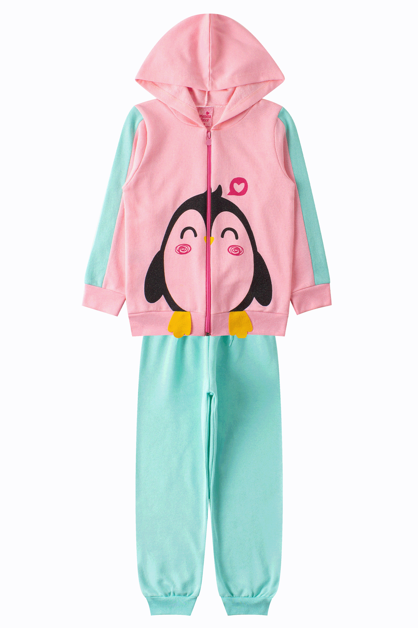 Conjunto Infantil Feminino Pinguim Rosa composto por duas peças. Jaqueta confeccionado em moletom peluciado (100% algodão), gola redonda com capuz, abertura frontal com fecho em zíper, estampa frontal com detalhe de glitter e aplique frontal de patinhas em feltro, mangas com recorte e aplique de cor contrastante (100% algodão), punhos. Calça confeccionado em moletom peluciado (100% algodão), cós com elástico e aplique frontal de cordão decorativo, punhos.