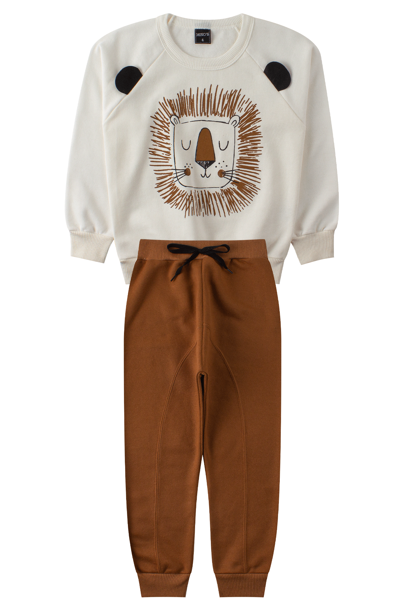 Conjunto Infantil Masculino Moletom Peluciado Lion Natural composto por duas peças. Blusão confeccionado em moletom peluciado (85% algodão no mínimo), gola redonda em ribana, estampa frontal com aplique interativo de orelhinhas em feltro, punhos e barra em ribana. Calça Saruel confeccionado em moletom peluciado (85% algodão no mínimo), cós com elástico em ribana e aplique frontal de cordão decorativo, punhos em ribana.