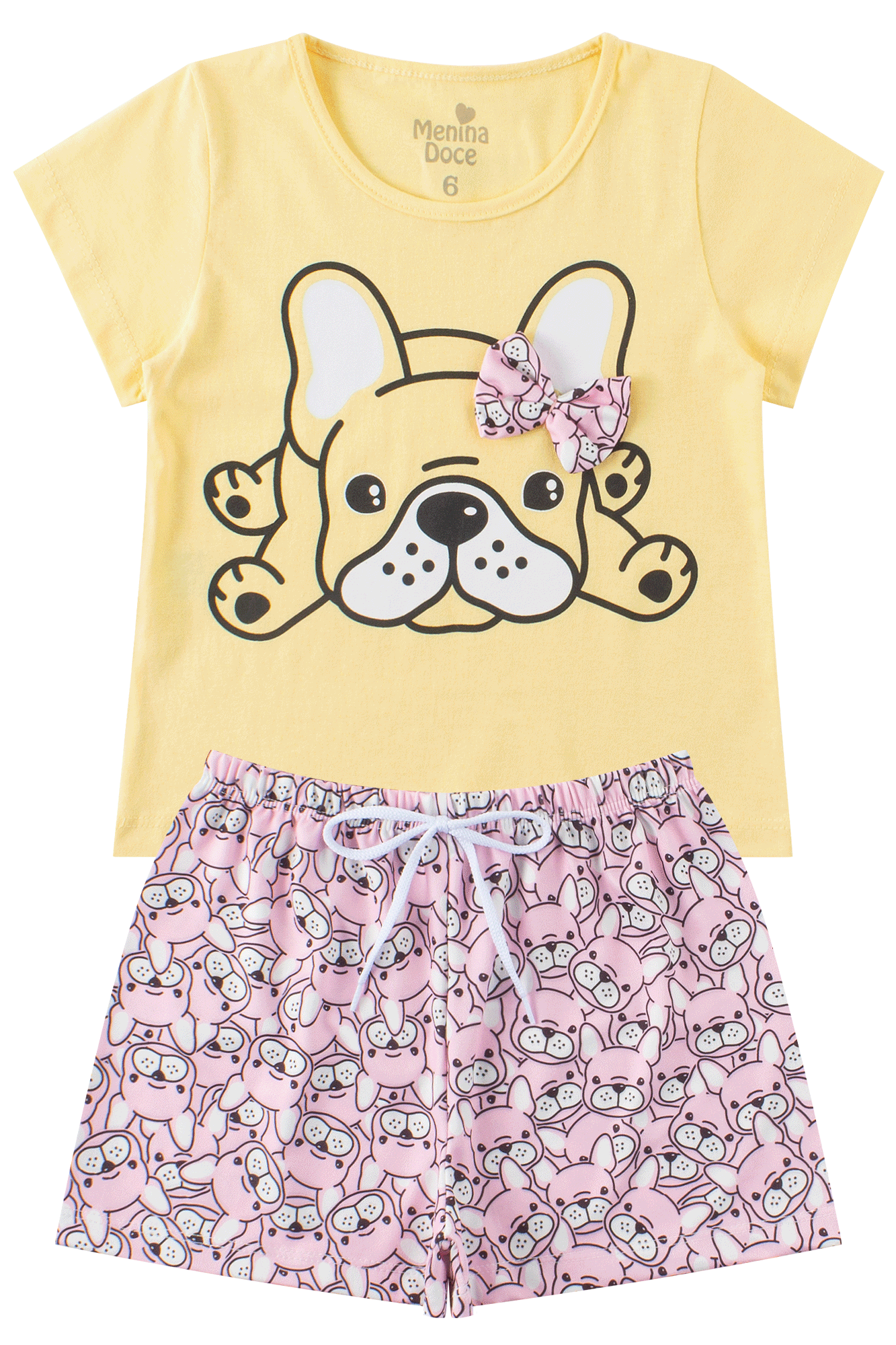 Pijama Infantil Feminino Meia Malha/Suplex Sublimado Dog Amarelo composto por duas peças. Blusa confeccionada em meia malha (100% algodão), gola redonda, estampa frontal brilha no escuro com aplique em laço sublimado (100% poliéster). Shorts confeccionado em suplex sublimado (100% poliéster), cós com elástico e aplique frontal de cordão decorativo.